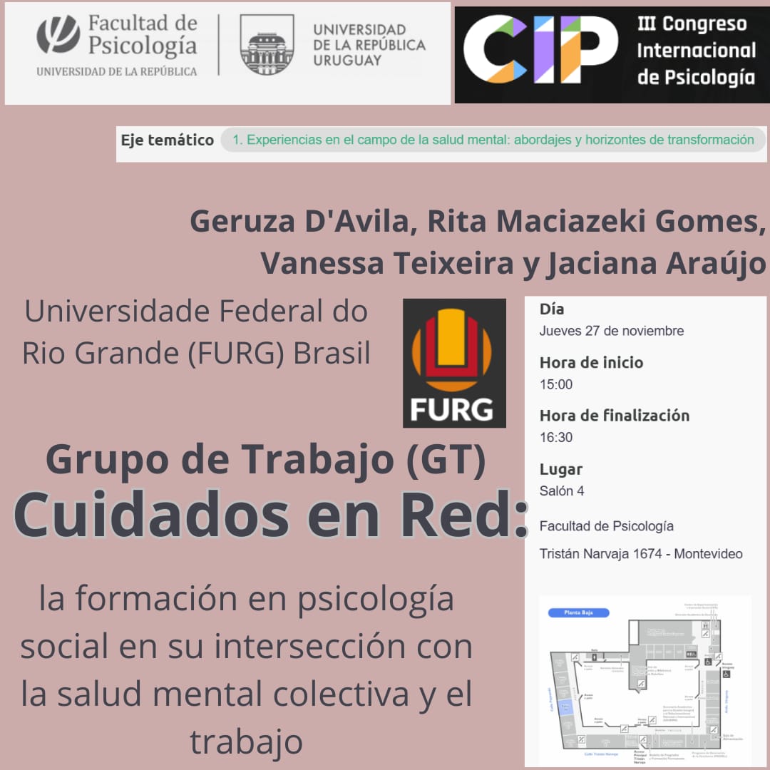 Nesta quinta-feira, dia 27/11, as professoras do curso de Psicologia Geruza D'Avila, Rita Maciazeki Gomes, Vanessa Teixeira Andina e a psicóloga servidora da PRAE, Jaciana Araújo, estarão presentes no III Congreso Internacional de Psicologia, realizado pela Universidad de la República Uruguay, apresentando o seguinte trabalho: "Cuidados en Red: La formación en psicología social en su intersección on la salud mental colectuva y el trabajo".